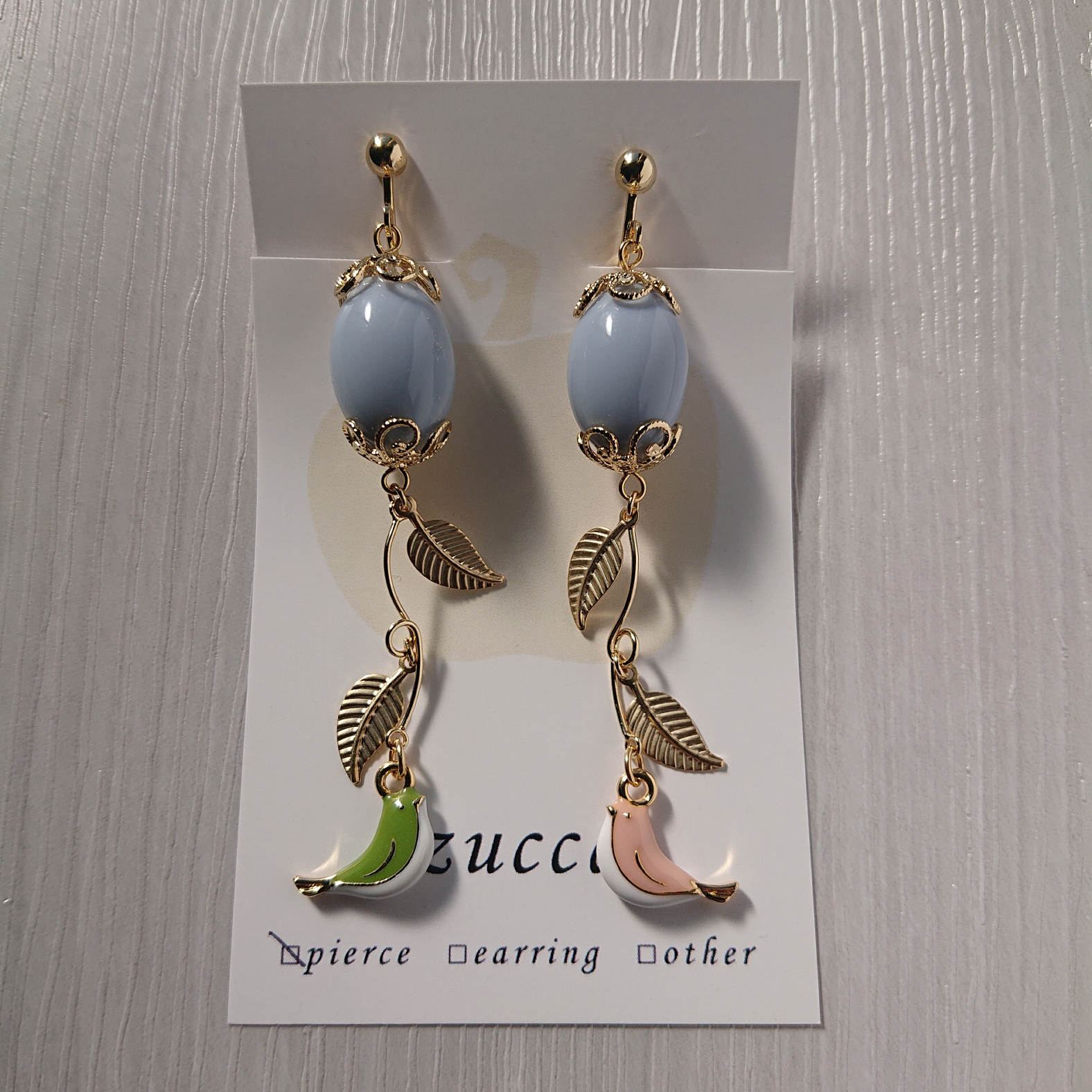 小鳥と卵をモチーフにしたイヤリングです。淡めの可愛らしいカラーでまとめました。